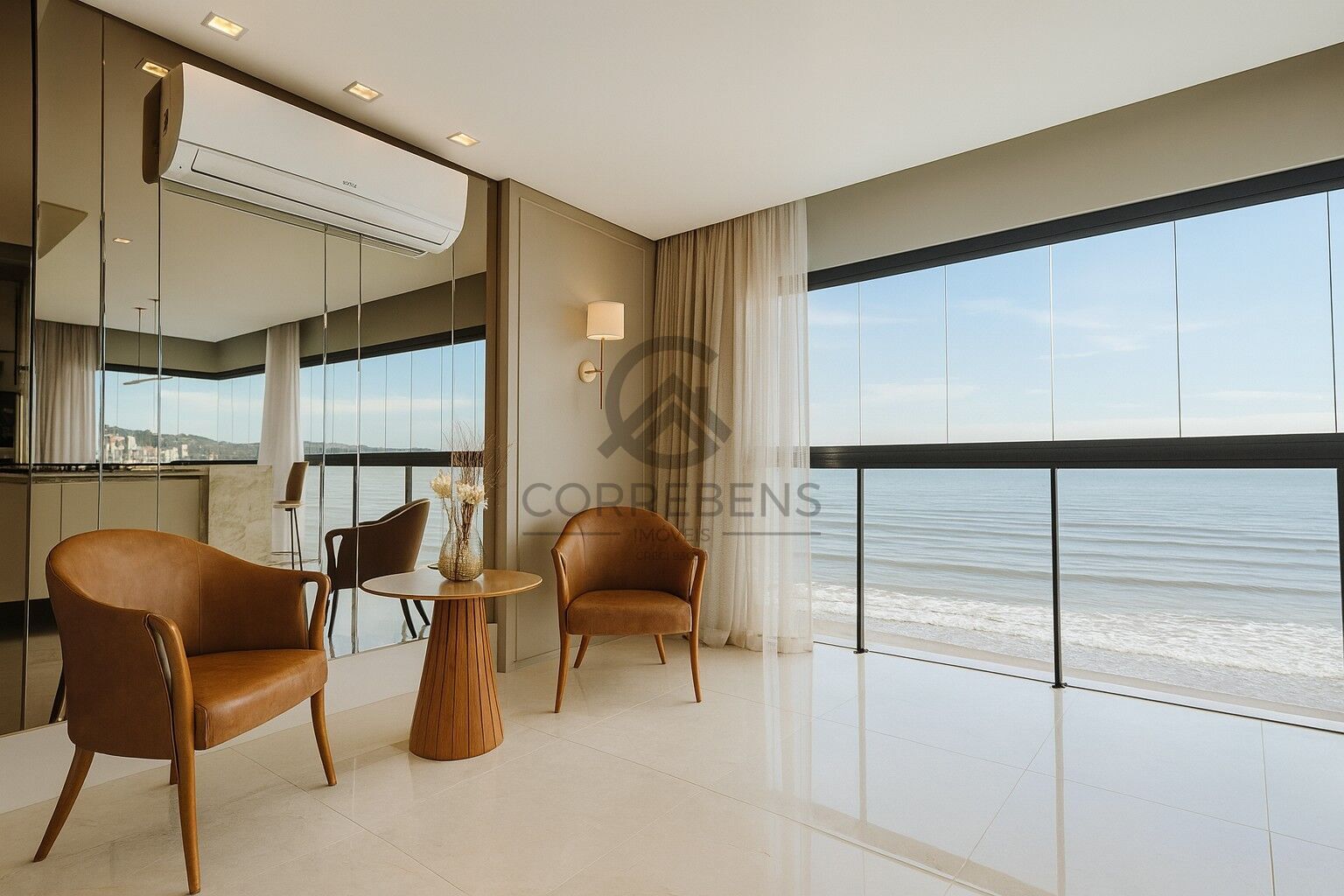 • Living com sacada integrada de frente para o mar
